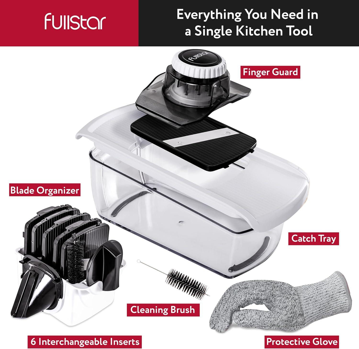 Fullstar Mandoline Slicer for Kitchen, Fruit Cutter, Cheese Grater, Cucumber Slicer, Veggie Spiralizer, Food Cutter & Kitchen Gadgets with Safety Glove (6 in 1, White)(Black)