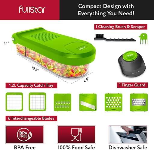Great Value & Quality – The Fullstar 5-cup vegetable chopper is an affordable mandoline slicer and cheese grater that doesn't compromise on quality. It includes 6 stainless steel blades, 1 cleaning brush, 1 finger guard, and a 1.2L container for safe and efficient meal prepping. Designed with a finger guard to protect your hands while slicing.