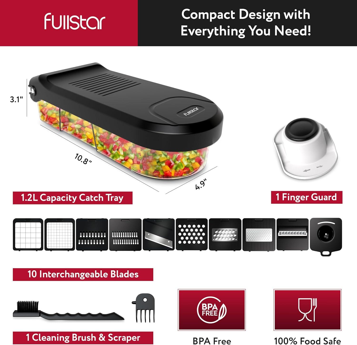 Complete Food Prep Station – Transform ingredients with multiple blade options: 5mm and 2mm slicers, coarse and fine graters, spiral blades, ribbon cutter, and more. Each blade delivers precise cuts, while the TPU grip handle provides perfect control.