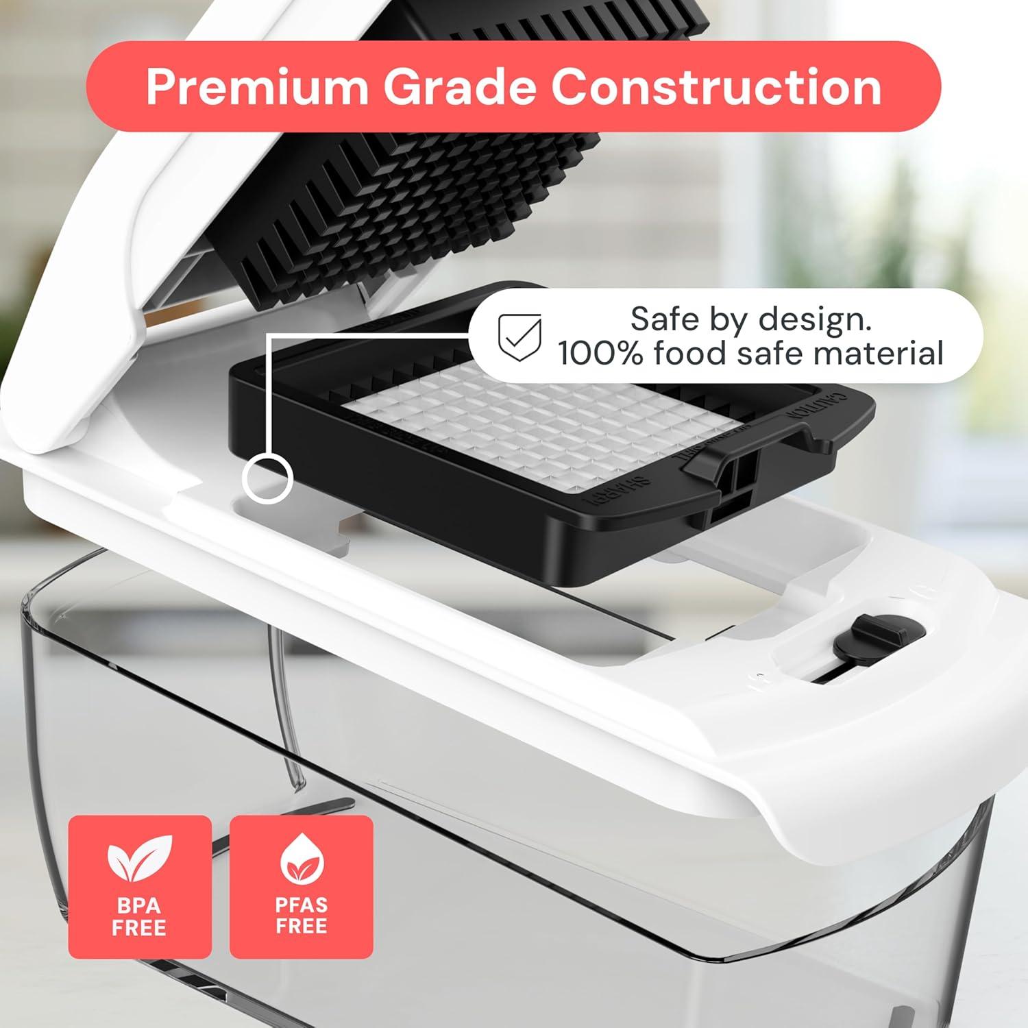 5-Star Design – The soft-grip TPU handle ensures controlled chopping, while the non-skid rubber base keeps the BPA-free veggie chopper steady on any surface, wet or dry. The built-in catch tray keeps counters clean and mess-free.