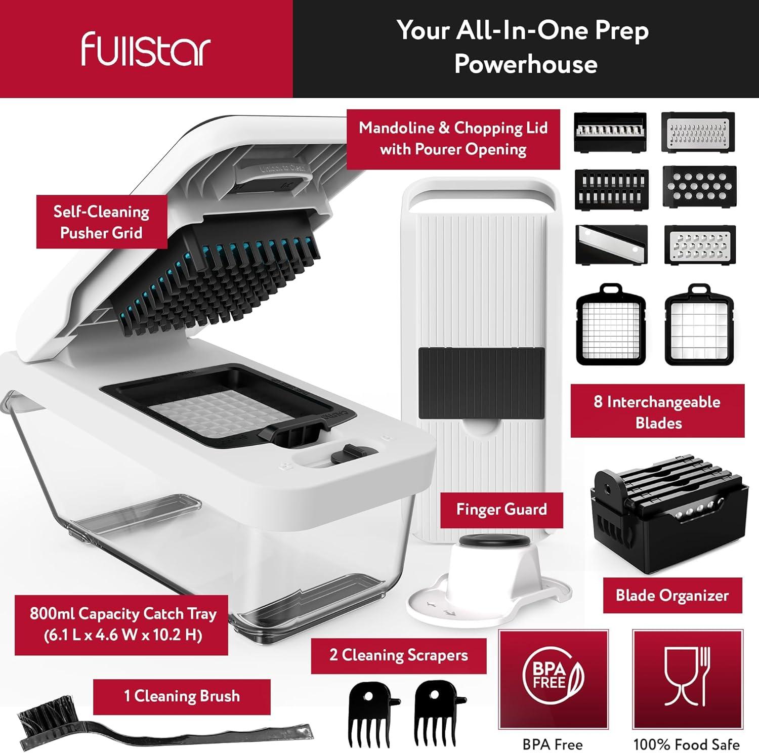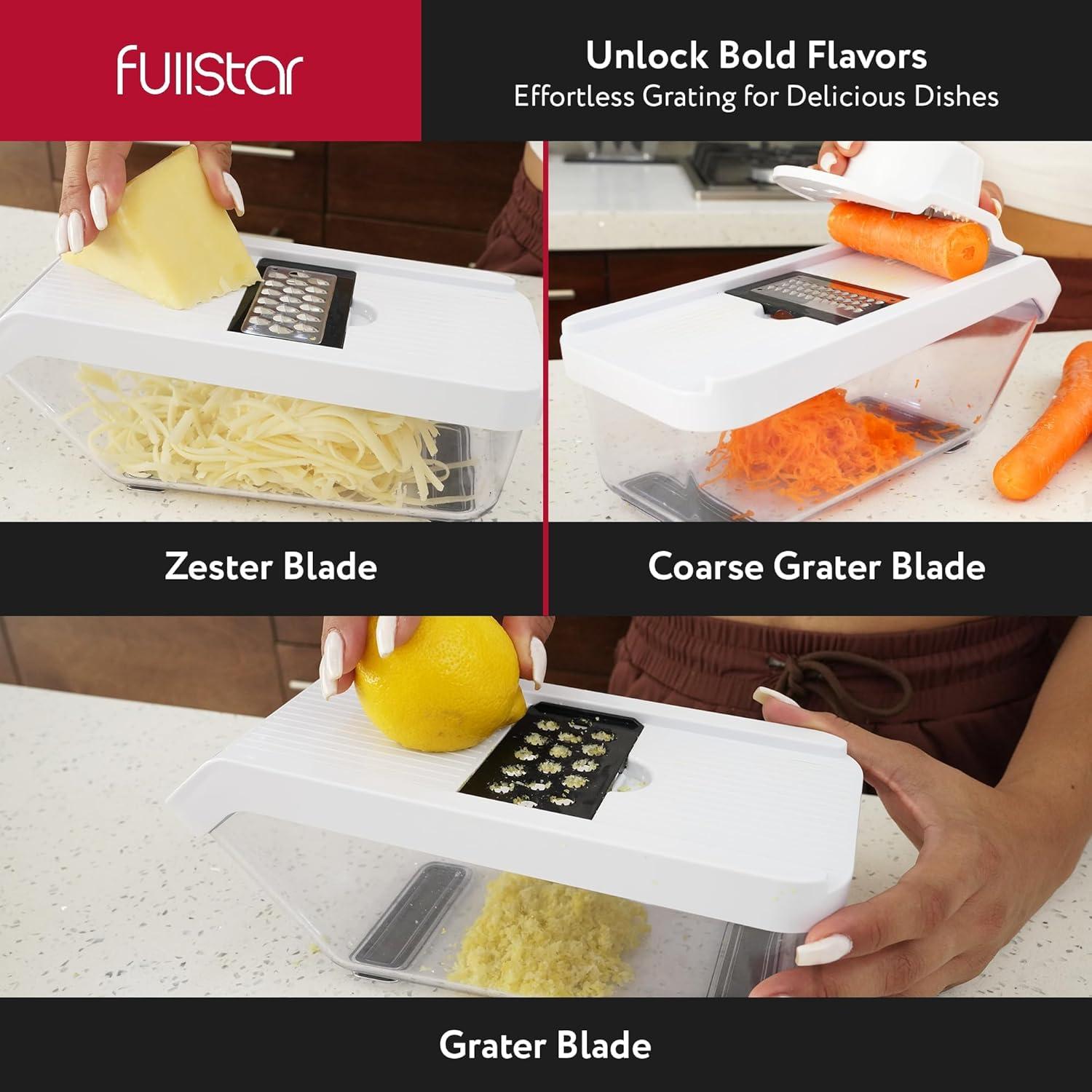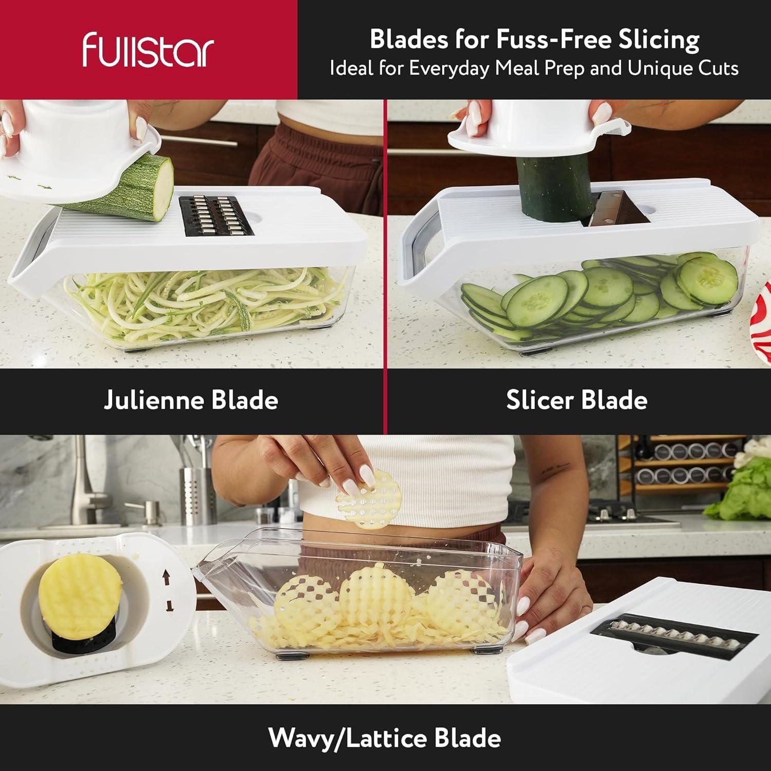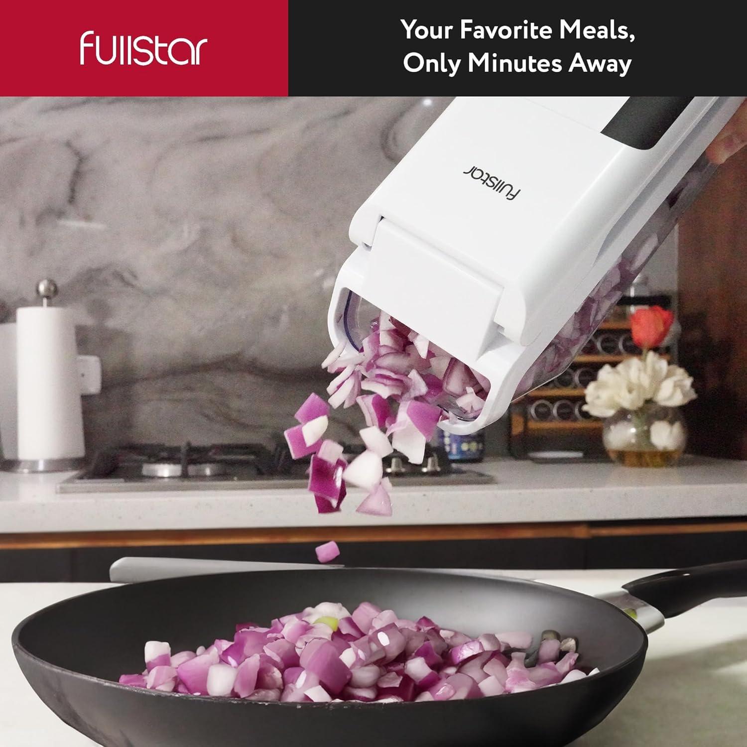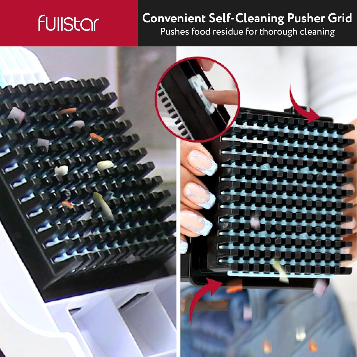 Innovative Self-Cleaning Pusher Grid – No mess, no stress! Our onion chopper's innovative self-cleaning grid pushes food residue forward for easy removal from the blades. Prep with ease and clean up in seconds with Fullstar's innovative vegetable slicer.